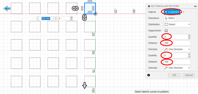 The Rectangular Pattern command/tool will help you easily create many different squares at a set distance from each. After that, it’s simply time to Extrude. |
